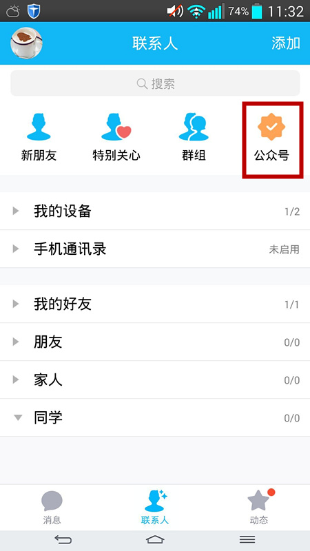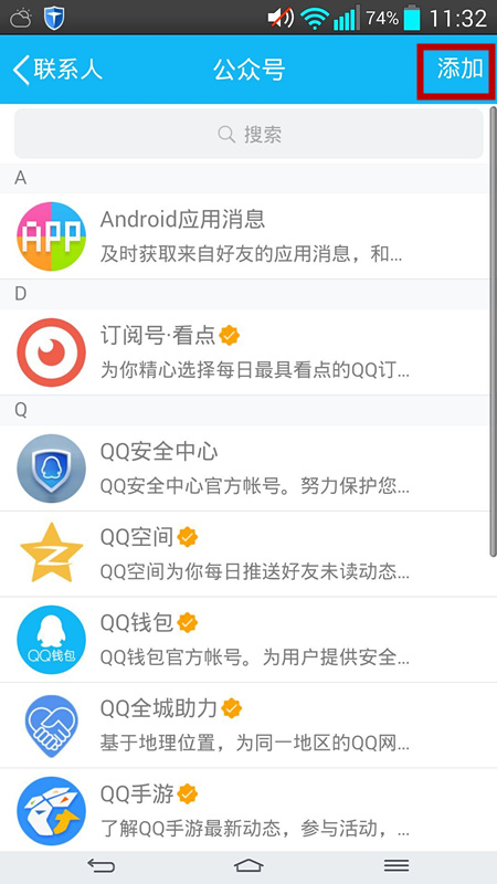 手机QQ升级到最新版本,点击“联系人”,点击上方栏目中的“公众号”,点击“添加”直接搜索“华体会网页版登录入口”即可关注。