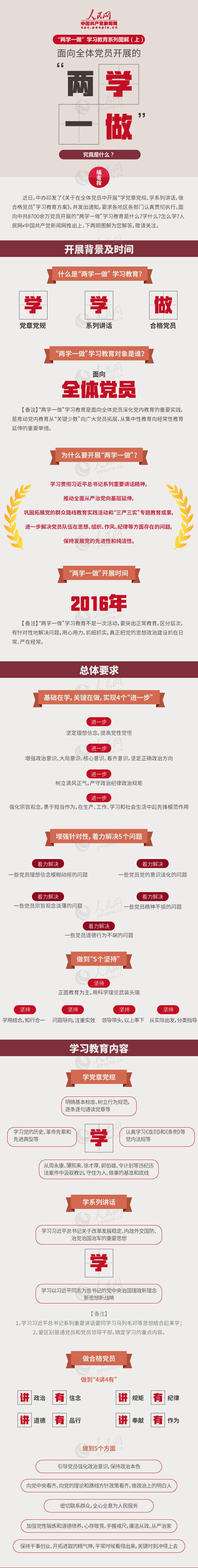 那么,面向中共8700余万党员开展的“两学一做”学习教育究竟是什么?学什么?要怎么学呢?宣传部转载了中国共产党新闻网“两学一做”学习系列教育图解,希望以更加直观的形式,阐述“两学一做”。