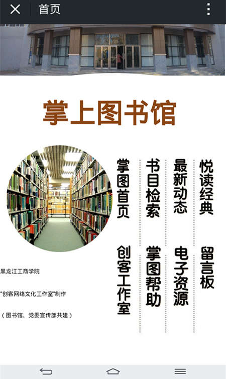 建立在“华体会网页版登录入口微思享”平台上的掌图(微信搜hljgsxy),学生可用手机点击各个模块,体验检索、电子资源下载、经典推荐、创客文化介绍(建设中)、留言建议等特色服务
