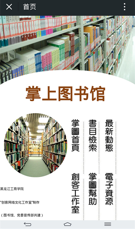 由我校图馆、党委宣传部共同在微信公众平台上搭建的“掌上图书馆”近日隆重上线。全校师生可通过个人手机方便快捷的享用学校丰富的图书资源,把实体图书馆资源、服务整体“搬”进手机,随身携带、触手可及。