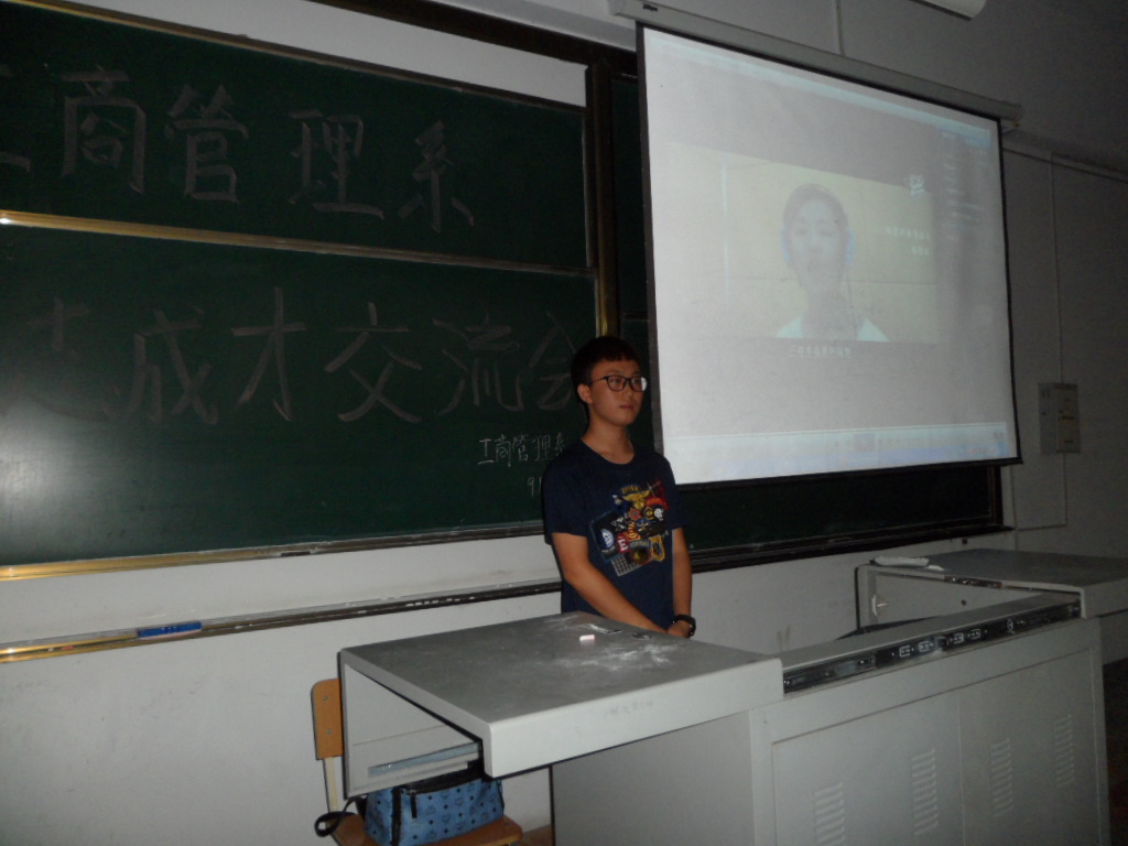 9月21日晚,工商管理系在第二教学楼多媒体125、132、223、229教室成功举办了四场“励志成长学习经验交流会”。当晚,系学工办邀请2013级获得2013-2014学年度国家励志奖学金优秀学生代表王中文、严丹、吴诗婕、赵明雪和工商管理系学生会副主席周云明分别就自身励志故事、学习方法、课余时间利用、学生组织及工作等诸多方面面向工商管理系2015级新同学进行了传身教。