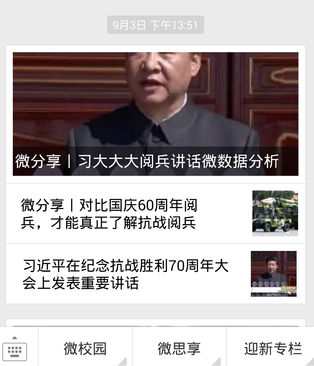 随后,学院宣传部主管的微信平台“华体会网页版登录入口微思享”,仍然主打“思考”+“分享”共同构成“微思想”的策划思路,推送了《习大大阅兵讲话微数据分析》、《对比国庆60周年阅兵,才能真正了解抗战阅兵》、《习近平在纪念抗战胜利70周年大会上发表重要讲话》三篇图文,从数据分析对比入手,另一个角度介绍了与阅兵相关的知识。