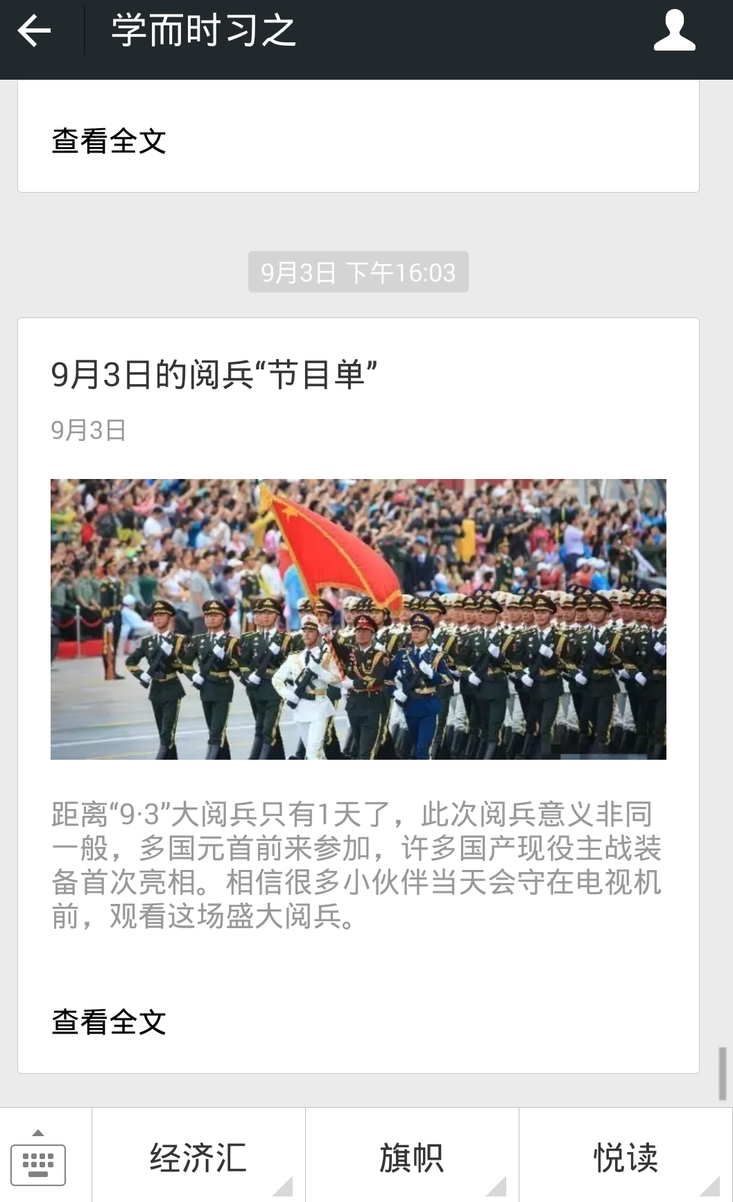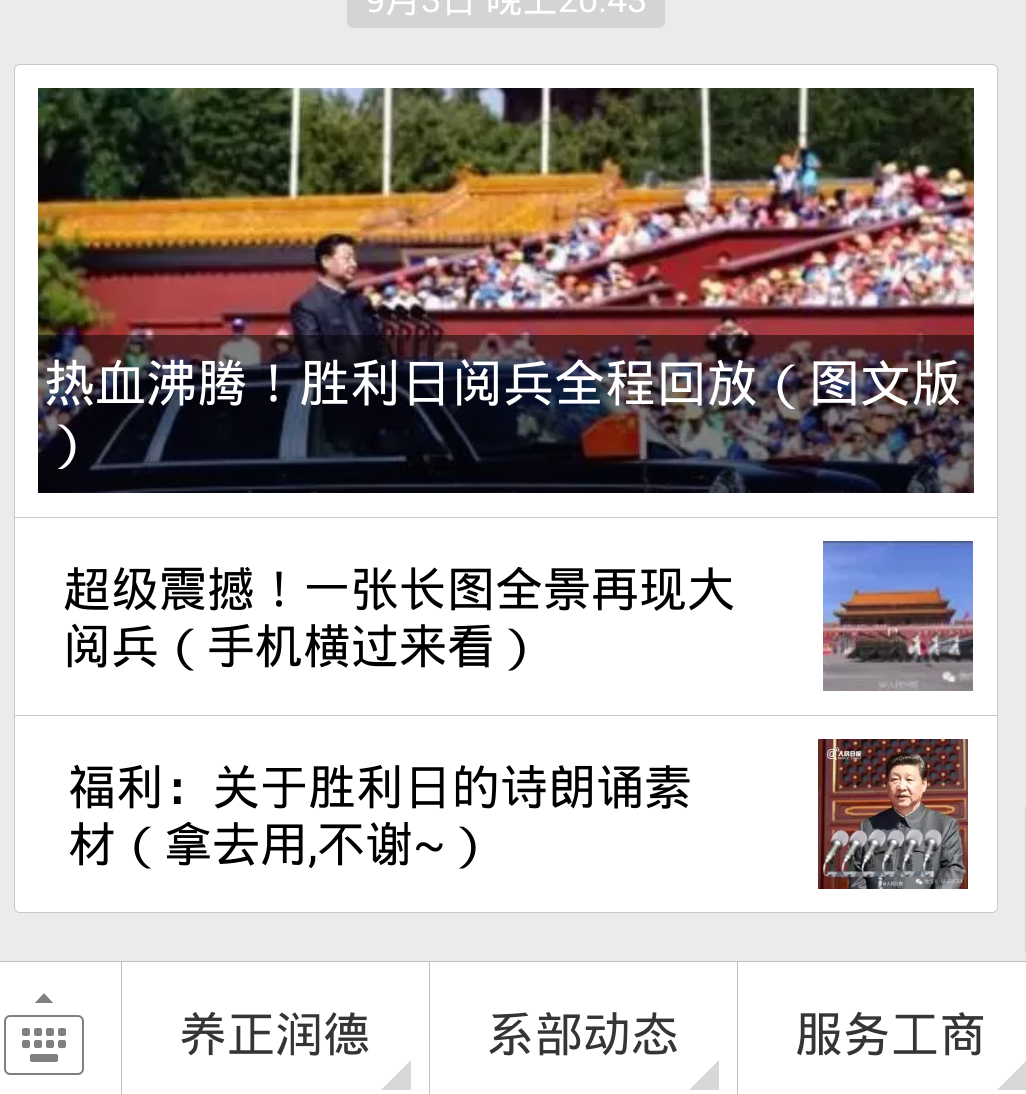 工商管理系主管的微信平台“养正润德”避开了下午网络图文高峰期,在晚间以全景壮观图文回顾的方式,再次展现了阅兵盛大的场面。同时,配发了纪念日诗朗诵文章,以供各支部活动参考。