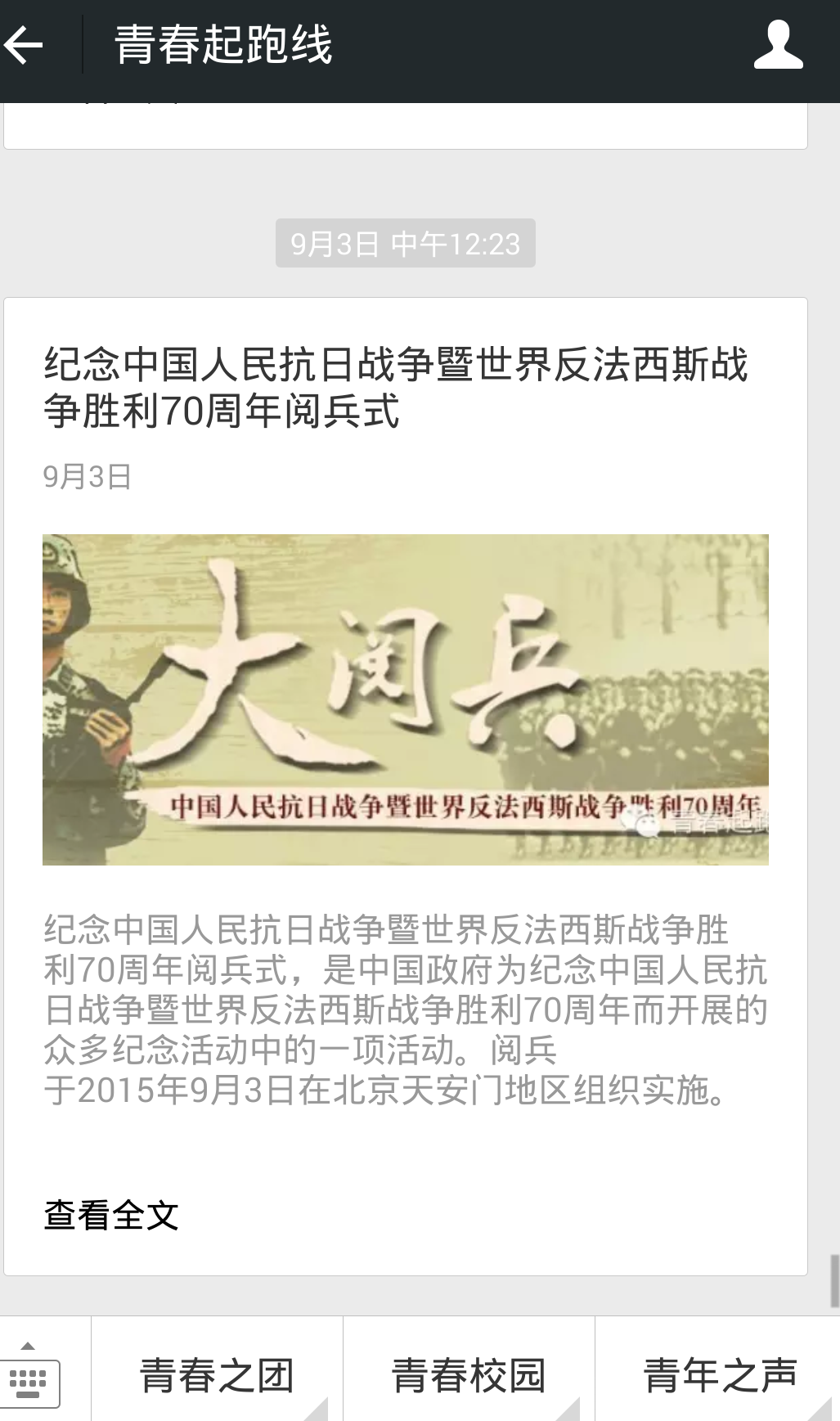 阅兵式刚刚结束后,校团委主管的微信平台“青春起跑线”、“团活督导检查”就推出了《纪念中国人民抗日战争暨世界反法西斯战争胜利70周边阅兵式》的回顾性图文。图文详细介绍了本次阅兵的背景、参阅部门、方阵情况和详细的流程,并辅以十分具有震撼力的阅兵现场图片加以说明。全景式再现了整个阅兵式,为没有看到阅兵的同学们,第一时间推送了相关图文报道。