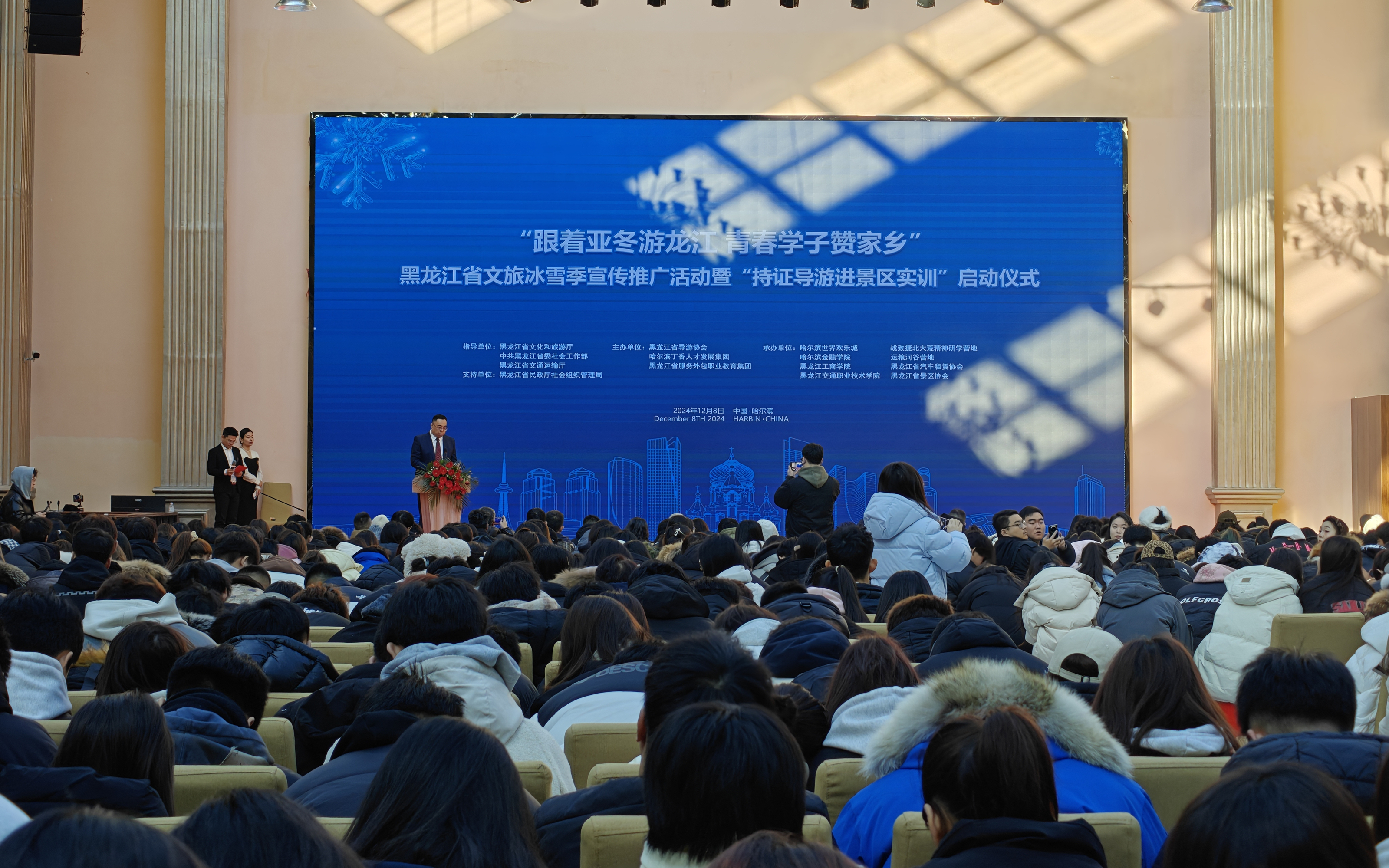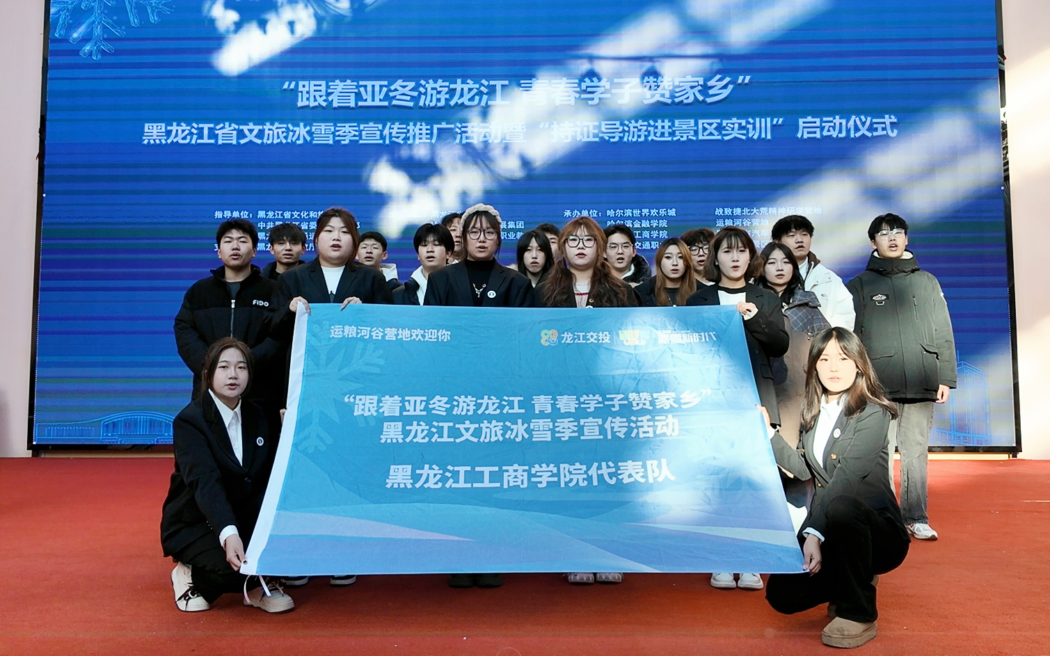 日前,由黑龙江省导游协会与哈尔滨市丁香发展集团等联合主办,我校等6家单位承办的“跟着亚冬游龙江 青春学子赞家乡”黑龙江省文旅冰雪季宣传推广活动暨首届龙江文旅线路短视频推广活动启动仪式在哈尔滨世界欢乐城举行。党委副书记、副校长张幸刚代表承办院校致辞,30名学生代表参加活动并接受授旗。