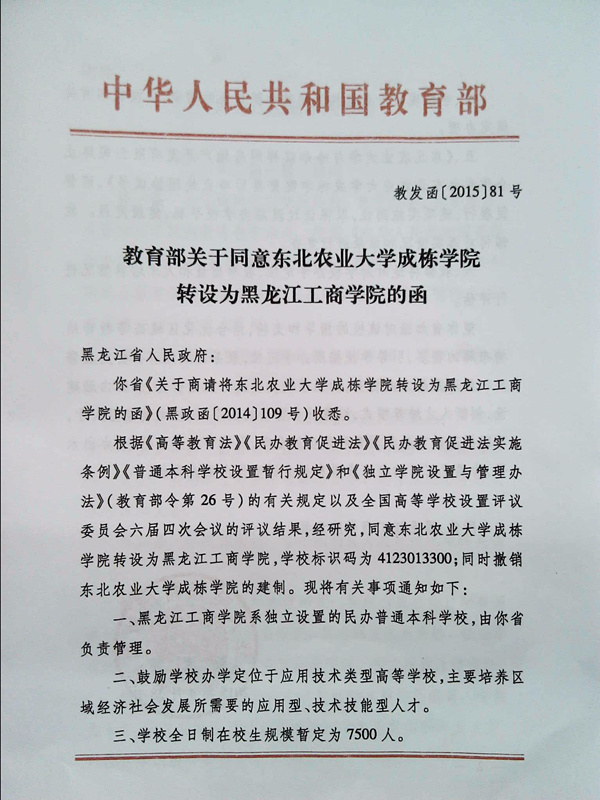 4月30日,国家教育部于正式下发《关于同意东北农业大学成栋学院转设为华体会网页版登录入口的函》(教发函[2015]81号),批准我校转设更名为华体会网页版登录入口,由黑龙江省负责管理,学院标识代码为4123013300。这标志着一所新的普通本科高校落户冰城哈尔滨。华体会网页版登录入口将继续以邓小平理论、“三个代表”重要思想和科学发展观为指导,认真贯彻落实党的十八大、十八届三中、四中全会精神,认真学习习近平总书记系列重要讲话和“四个全面” 战略布局精神,以国家中长期教育改革和发展规划纲要为统领,以教育部《关于完善本科学校设置工作的指导性意见》为指针,以推动学院内涵转型发展为主线,以强化学生技术应用和开发创新能力培养为重点,坚持育人为本、德育为先、实施素质教育,加大改革力度,充实办学条件、规范办学行为、提升办学水平,为把学院建设成为具有优美大学校园、优良教师队伍、丰厚教育资源、具有创新教学模式和开放办学理念的有特色,高水平的应用技术型民办大学而努力奋斗。