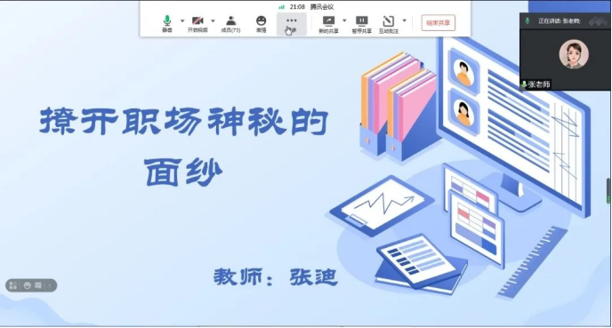 本次讲座以“撩开职场神秘的面纱”为题,从就业环境分析、求职技巧分享、职业生涯规划三方面为同学们进行讲述。首先,张老师结合所学专业为同学们分析了未来就业方向,并详细介绍如何选择适合自己的求职渠道。